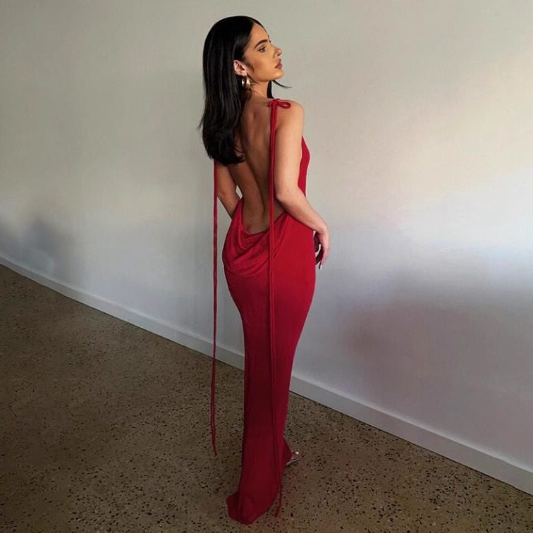 Stay effortlessly stylish this summer with this solid color backless maxi dress featuring a pile collar and slender strappy design. The slim-fit silhouette hugs your curves while keeping you comfortable in warm weather. Perfect for beach vacations, resort getaways, or casual summer outings, this lightweight dress combines sexy allure with relaxed elegance. Pair with sandals, a sun hat, and minimal accessories for a chic, vacation-ready look.