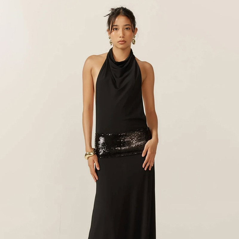 Step into elegance with this black halter maxi dress, featuring a backless design that subtly showcases the shoulders and back. The flowing floor-length skirt provides graceful coverage over the hips while creating a polished, sophisticated silhouette. Perfect for formal evenings, upscale events, or special celebrations, this versatile dress balances sexy allure with refined style. Pair with heels and minimal jewelry to achieve a chic, statement-making look that is both timeless and modern.